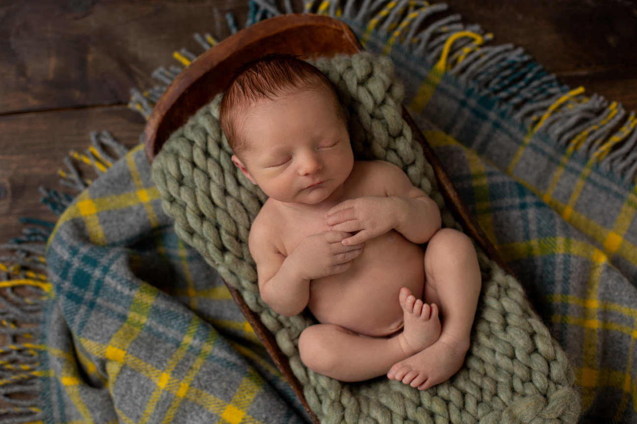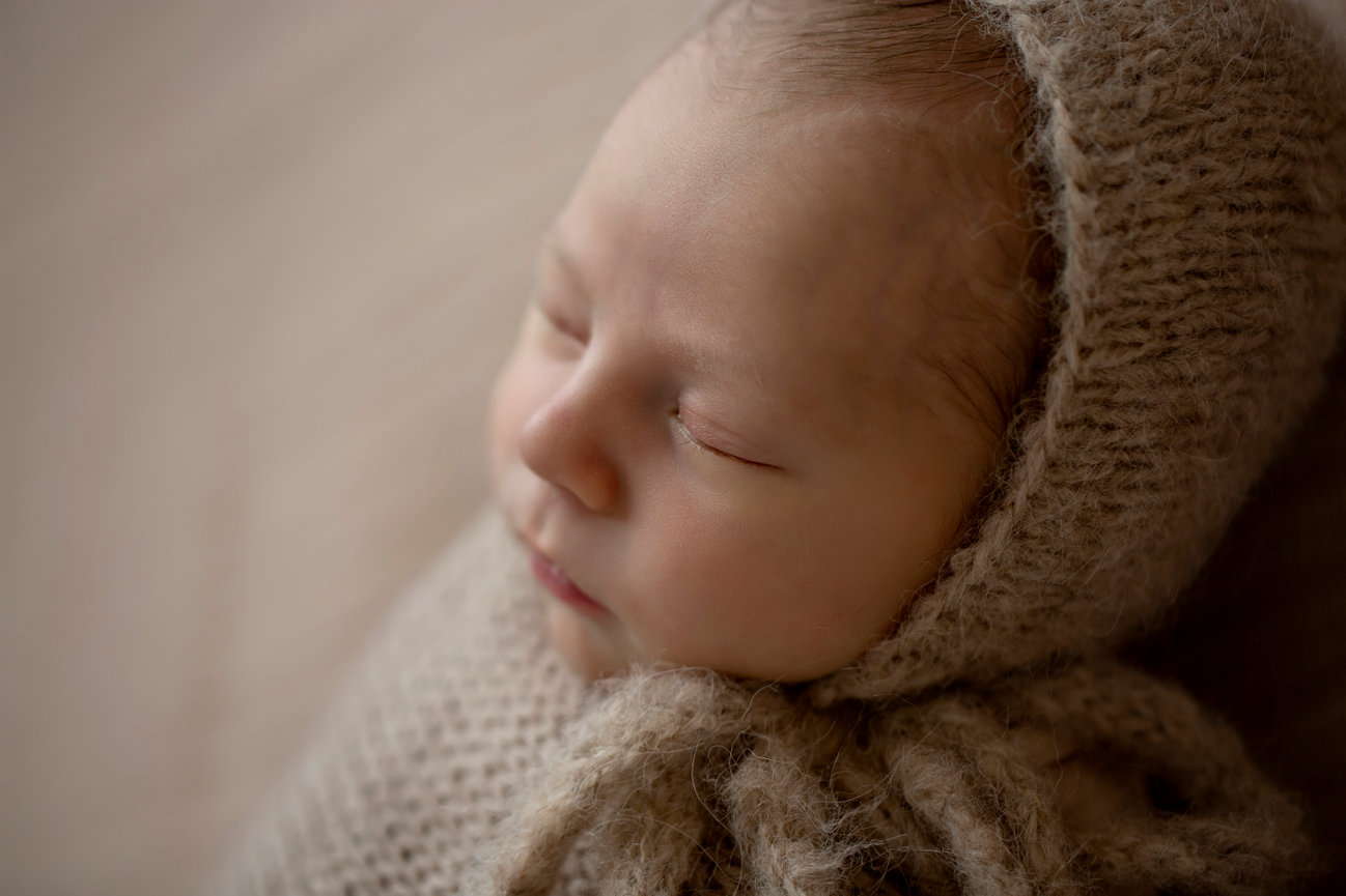 Newborn boy posed with his hands under his chin. He is lying on a beige backdrop and a knitted wrap is draped over him.
