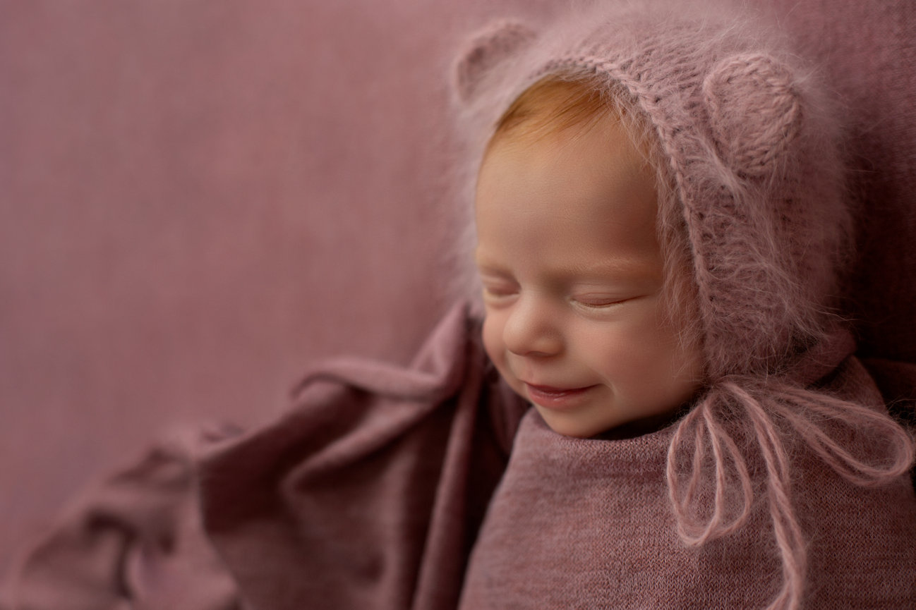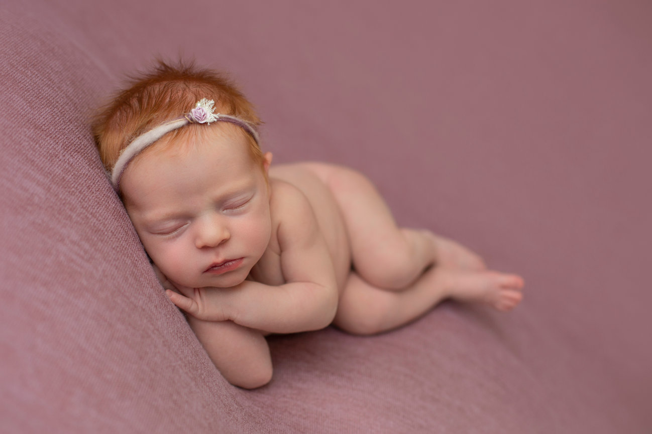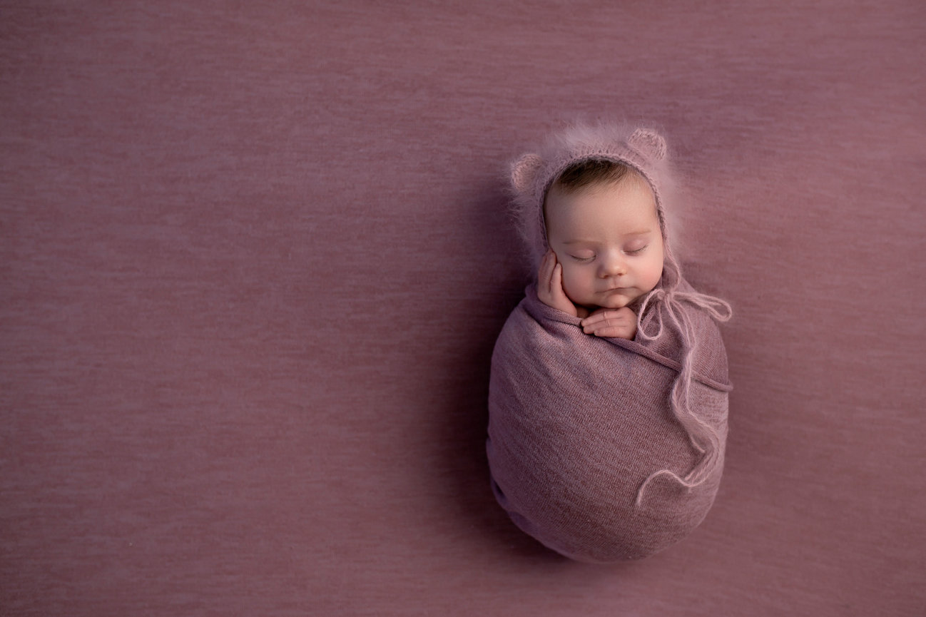 Dark skinned baby girl on mauve backdrop with matching wrap and headband, posed on her side with hands sweetly tucked under her cheek.