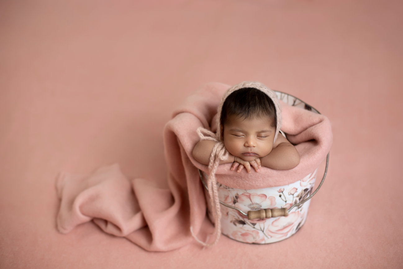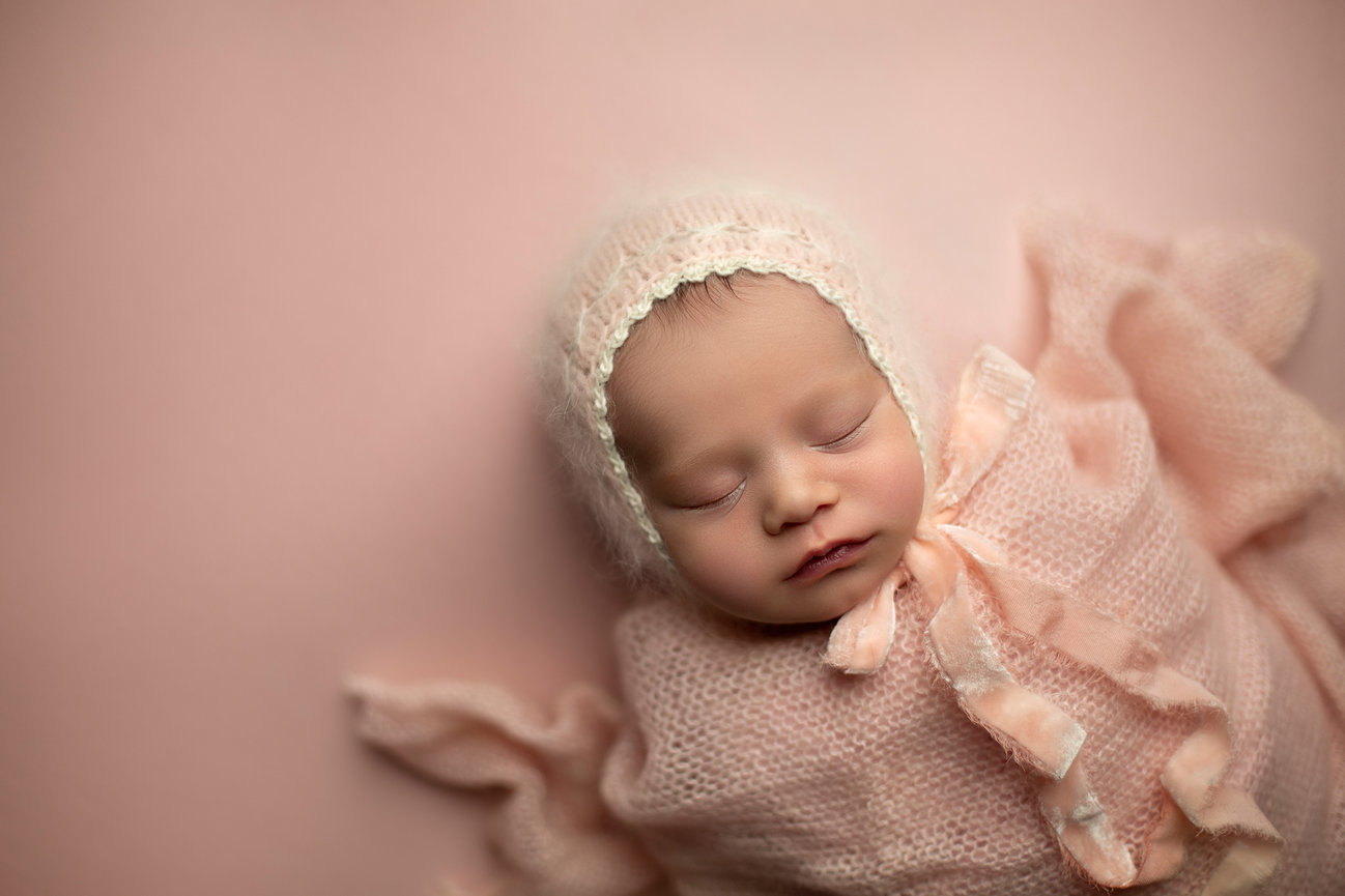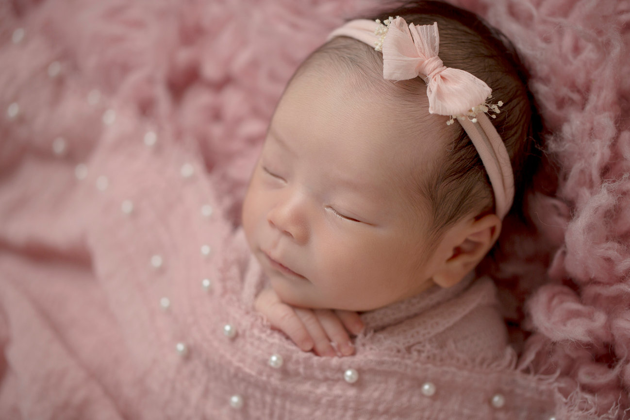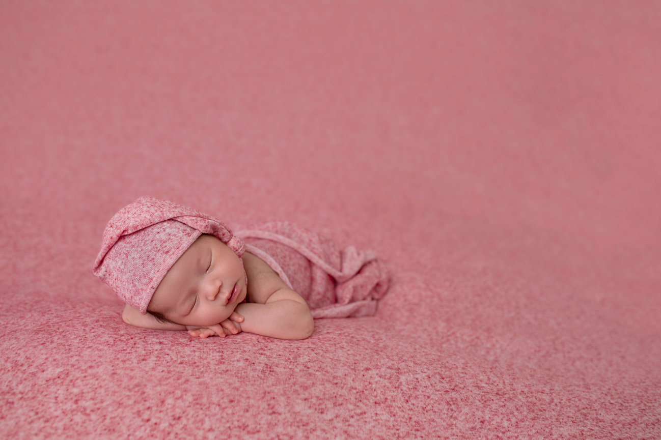 Dark skinned baby girl on mauve backdrop with matching wrap and headband, posed on her side with hands sweetly tucked under her cheek.