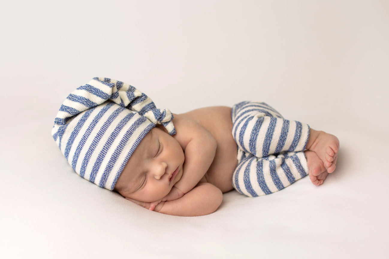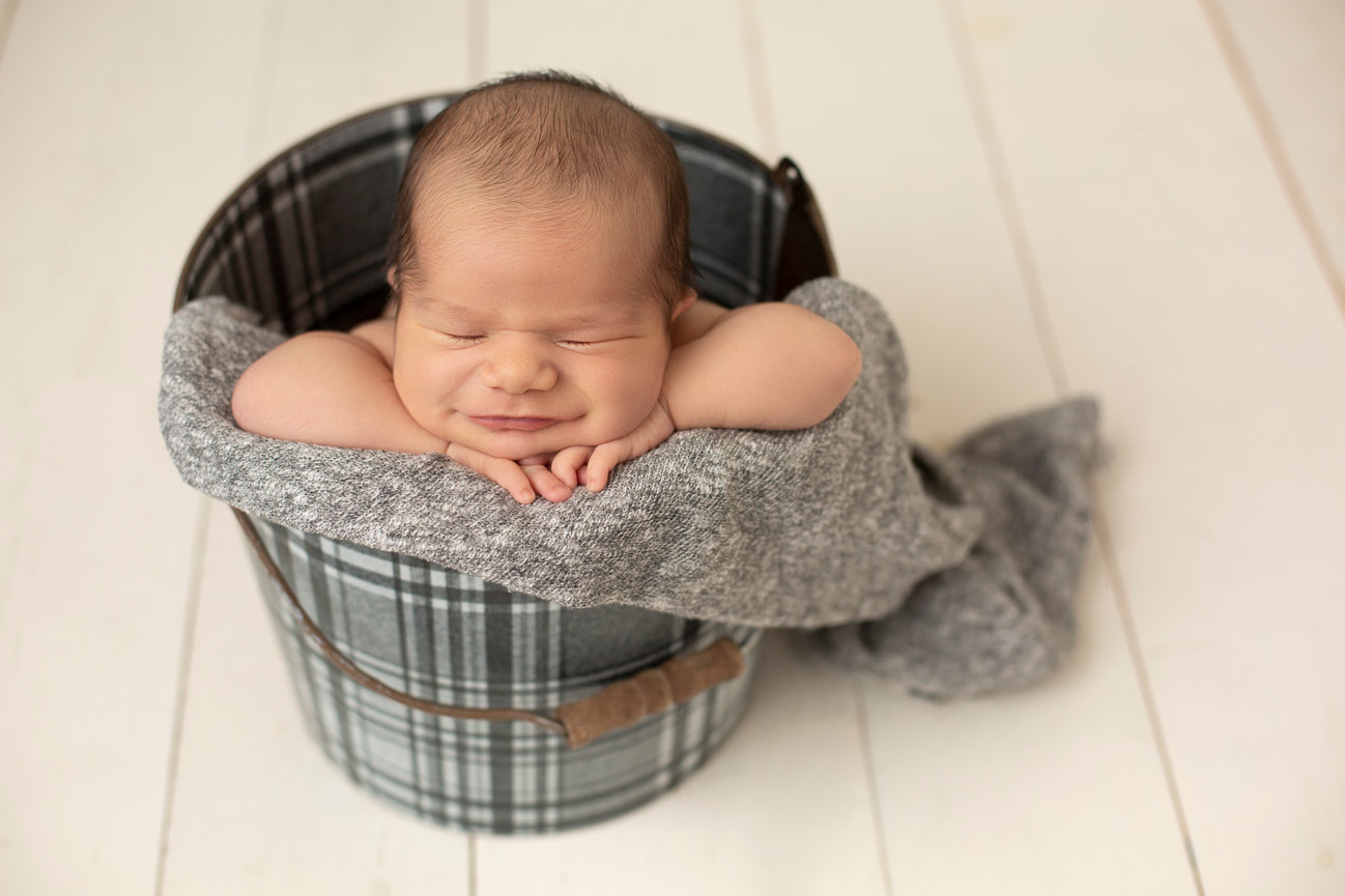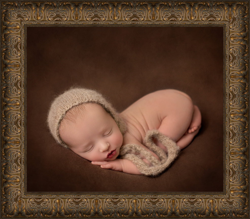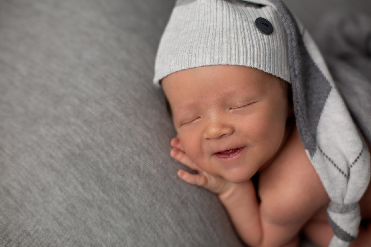 Clean, simple close up naturally posed newborn portrait of a baby boy with chubby cheeks. One hand is tucked beneath his chin while the other rests on his belly. Image is dramatically short lit with soft lighting to create a cozy and intimate feel.