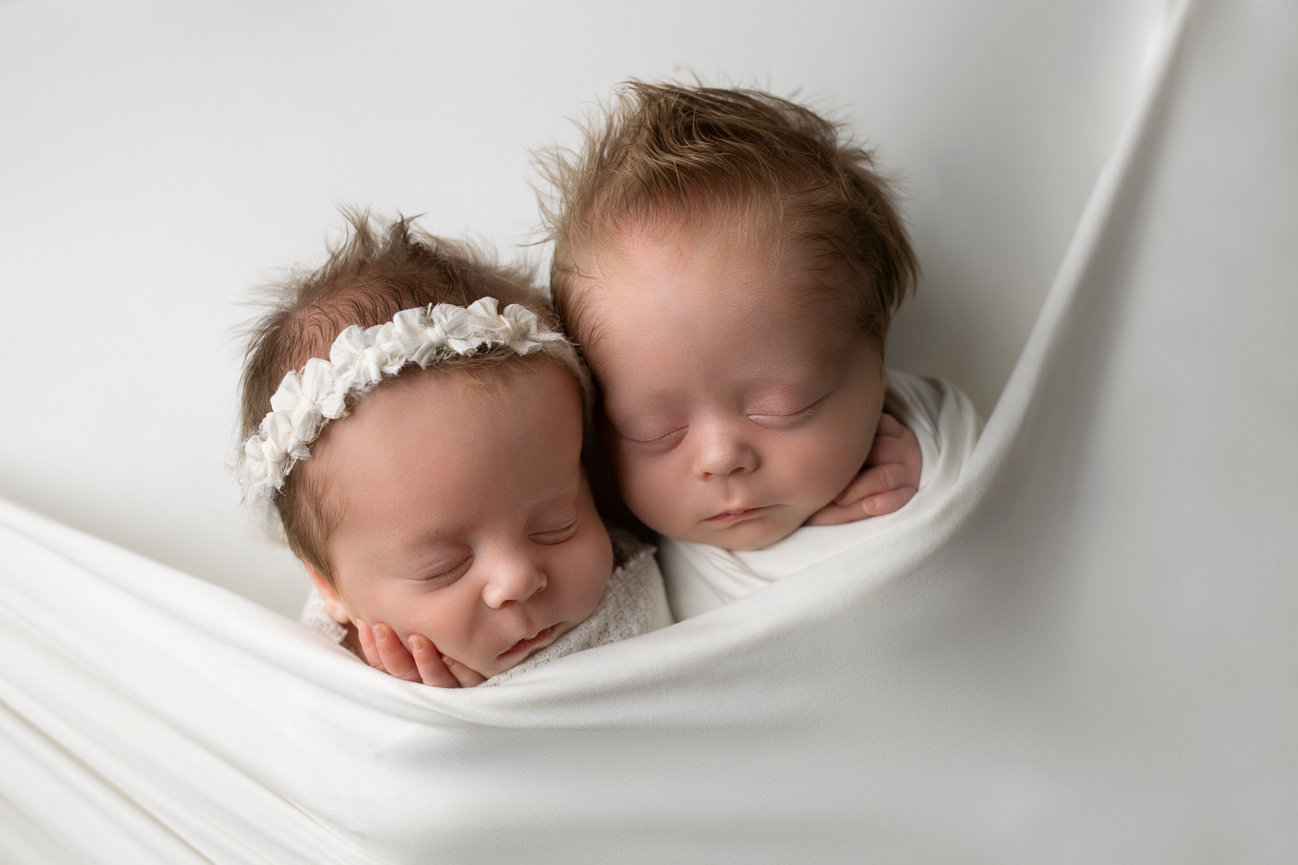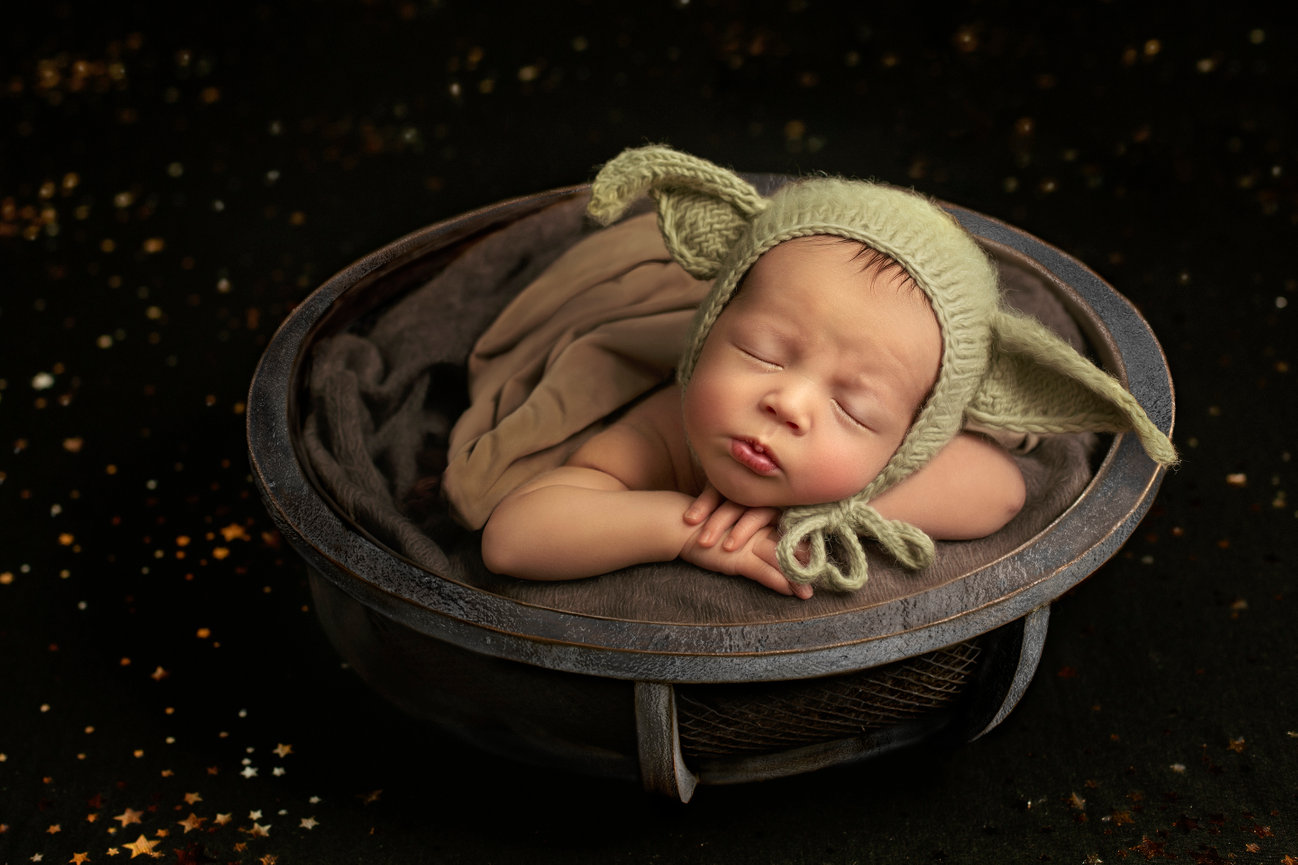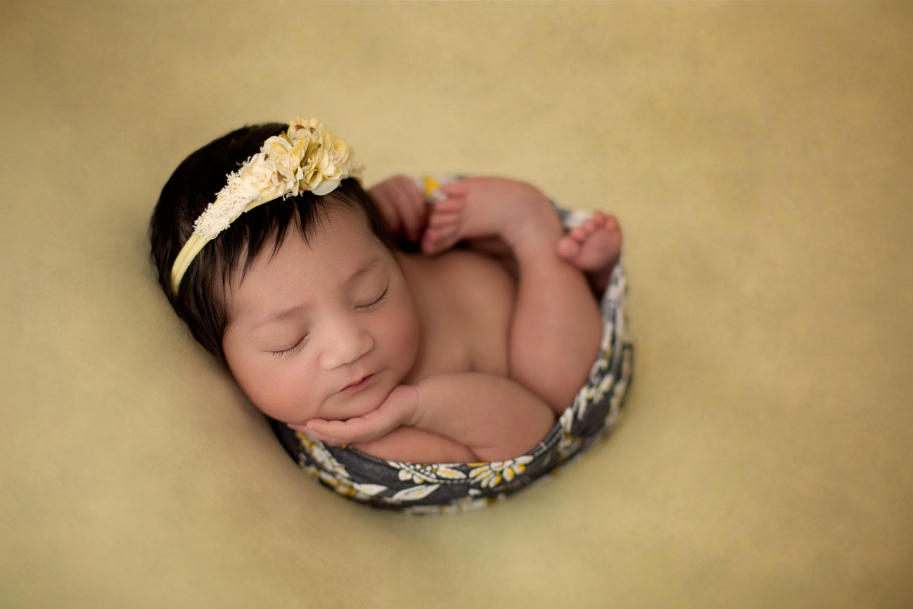 Clean, simple close up naturally posed newborn portrait of a baby boy with chubby cheeks. One hand is tucked beneath his chin while the other rests on his belly. Image is dramatically short lit with soft lighting to create a cozy and intimate feel.