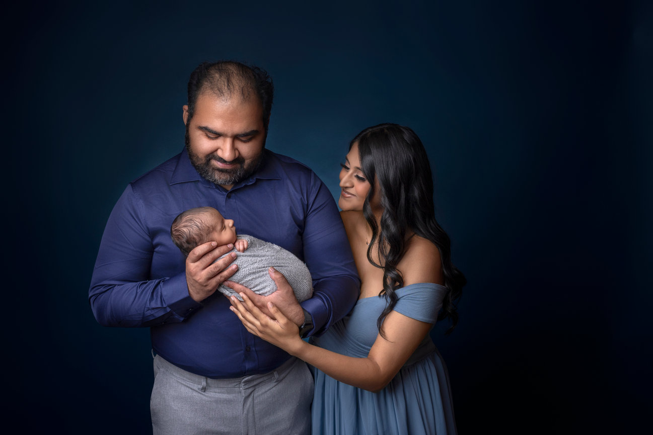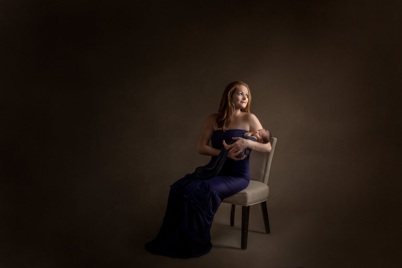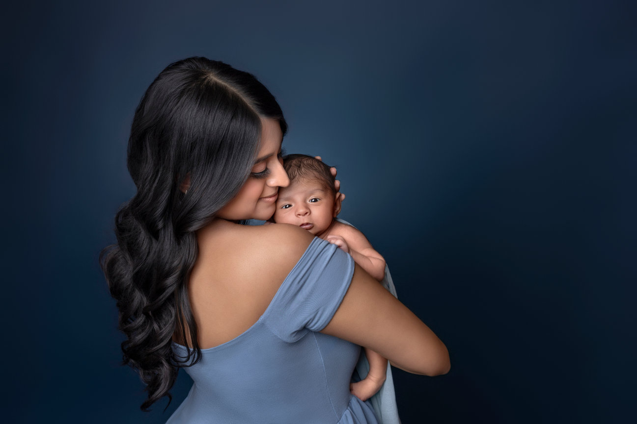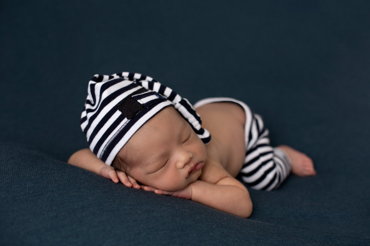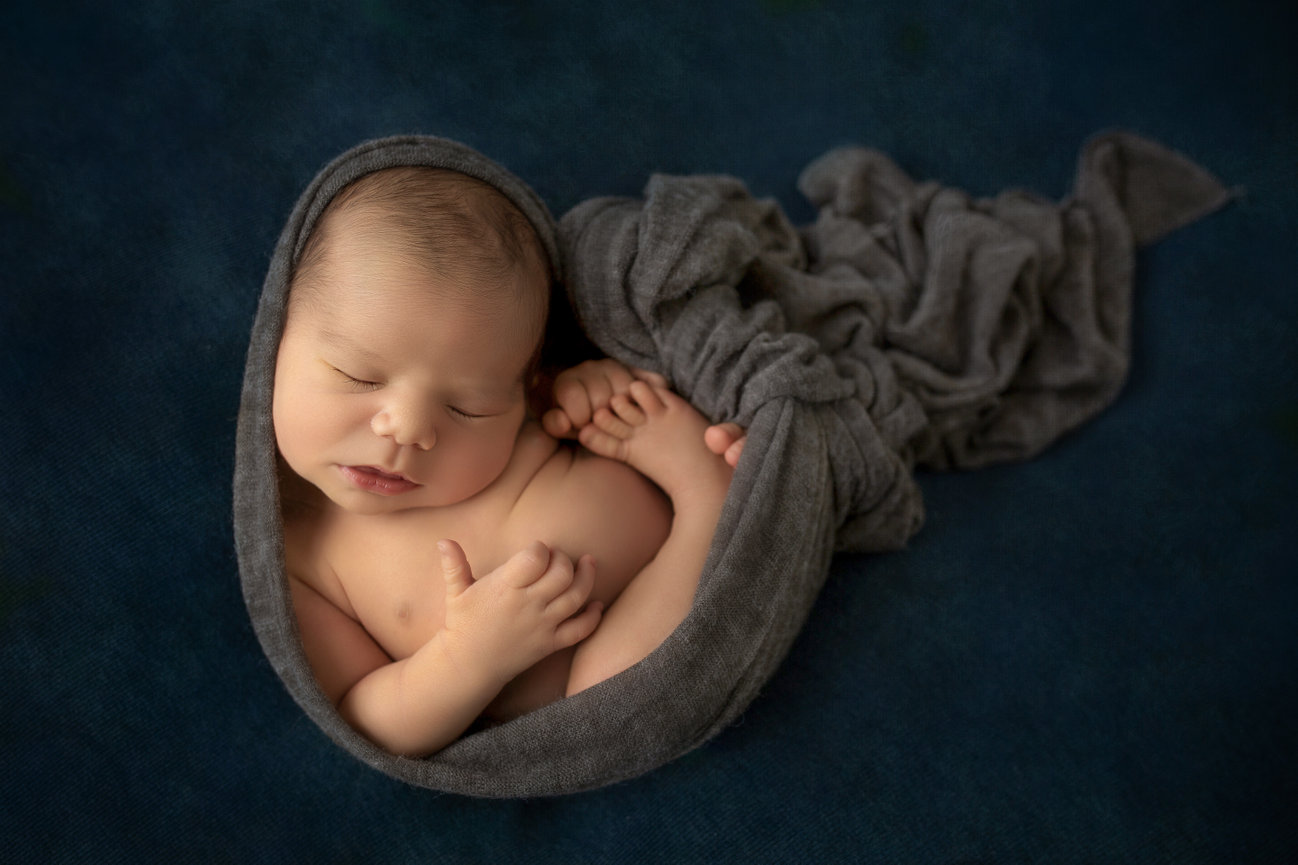 Portrait of a chubby little newborn boy with back rolls, draped with a soft navy blue wrap.