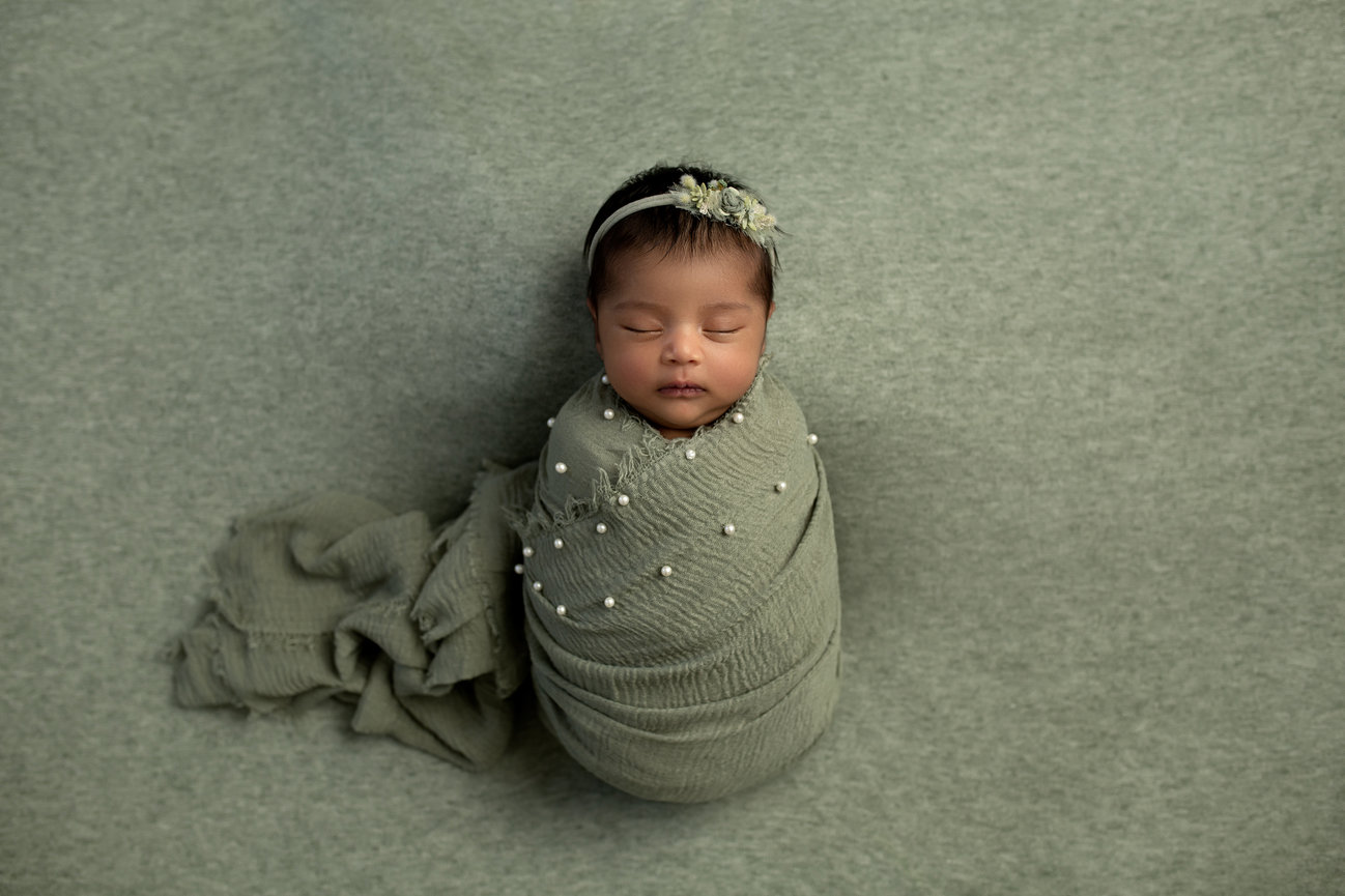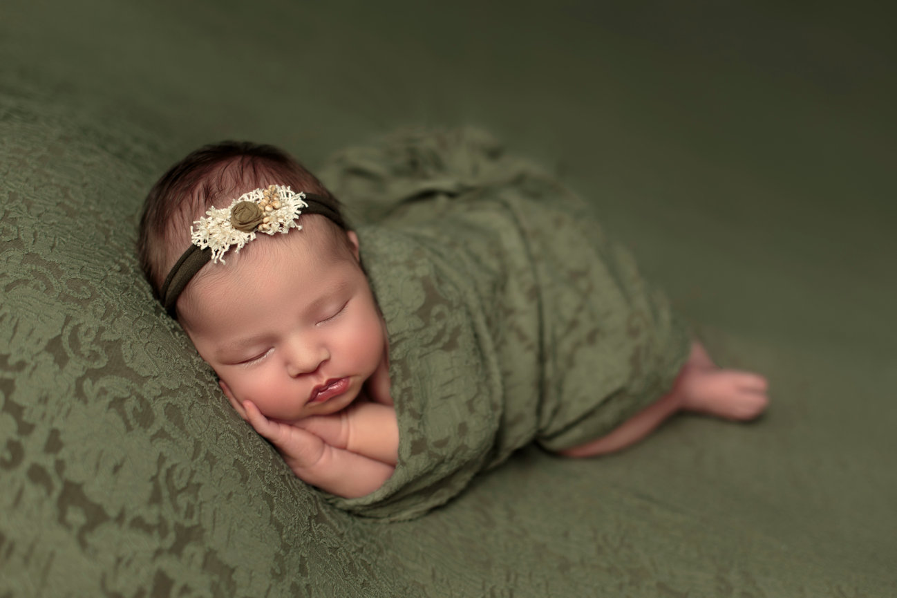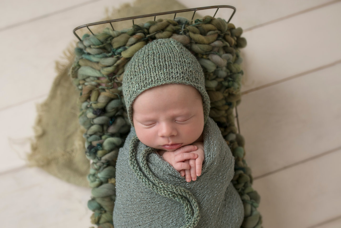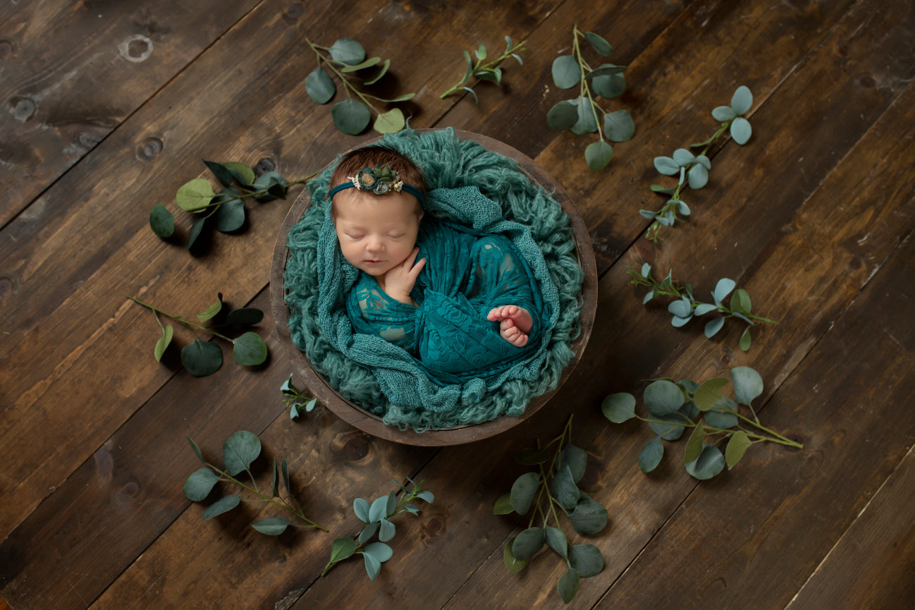 Modern farmhouse styled artistic baby photo. Baby is posed on is back, wrapped in a rustic green swaddle with matching bonnet, nestled into a nest of soft, brown blanket and burlap edging. Green leaves encircle the nest on a white shiplap.
